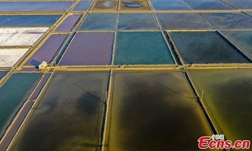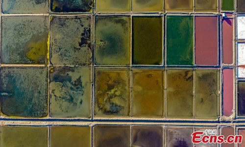 Aerial photo shows salt fields in Weihai, East China's Shandong Province. (Photo: China News Service/Wang Xiaogen)