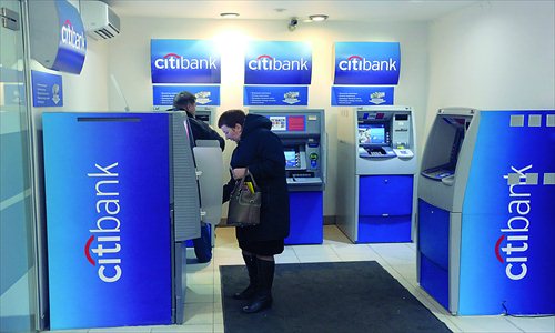 Customers use automated teller machines at a Citibank branch, operated by Citigroup Inc, in Saint Petersburg, Russia. File photo: CFP
