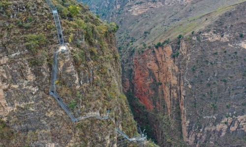 A steel ladder built along the cliff in Atulie'er Village, Zhaojue County, Nov. 23, 2019. (Xinhua/Wang Xi)