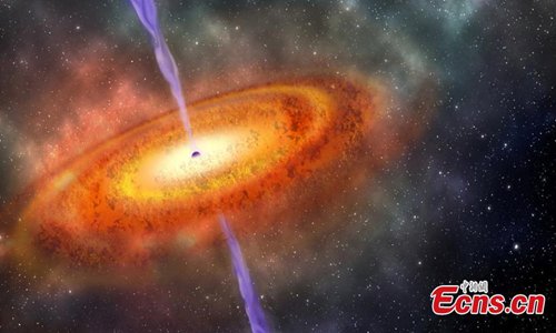 An artist's conception of the most-distant and oldest supermassive black hole ever discovered .The black hole resides in a quasar and its light had been traveling for 13 billion years before reaching Earth. It's a truly gargantuan black hole, some 800 million times the mass of our sun. The size amazed and puzzled astronomers, according to reports. ((Photo:Ecns.cn/VCG))