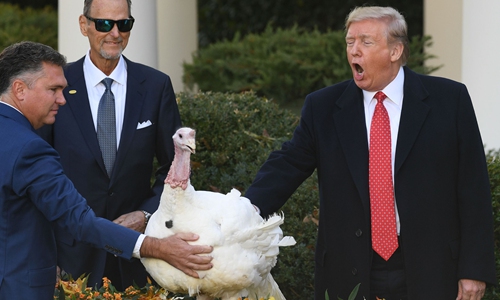 US President Donald Trump (right) pardons the National Thanksgiving Turkey during a ceremony in the Rose Garden of the White House in Washington. Photo: VCG