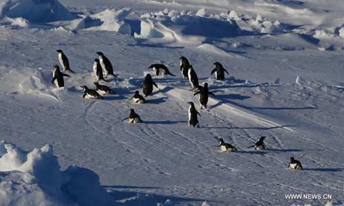 A group of penguins are seen in this photo taken from aboard China's polar icebreaker Xuelong 2 in Antarctica water on Nov. 19, 2019. China's icebreakers Xuelong 2 and Xuelong are carring out the country's 36th Antarctic expedition. (Xinhua/Liu Shiping)