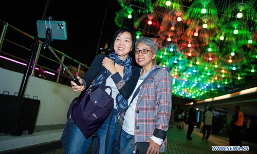 Visitors take a selfie during the 2019 Macao Light Festival in south China's Macao, Dec. 1, 2019. (Xinhua/Cheong Kam Ka)