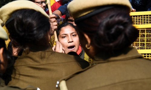 Police block demonstrators as they march to protest against the gang rape and murder of a 27-year-old veterinary doctor in Hyderabad, India on Monday. Photo: AFP