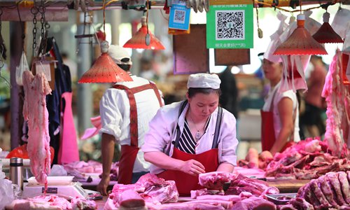 Chinese vendors sell pork in a market in Kunming, capital of Southwest China's Yunnan Province in June. Photo: IC