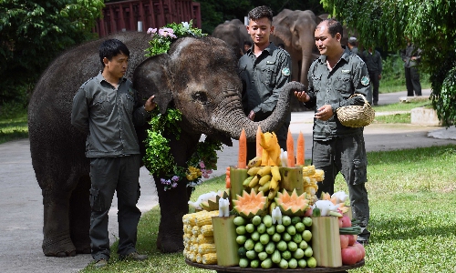 Staff members celebrate the birthday of Yang Niu, a four-year-old Asian elephant, during a public awareness activity on the occasion of World Elephant Day in a tourism area in the Dai Autonomous Prefecture of Xishuangbanna, southwest China's Yunnan Province, Aug. 12, 2019. Yang Niu was abandoned by her herd just days after birth. She was rescued and grew up in an elephant breeding and rescue center. (Xinhua/Yang Zongyou)