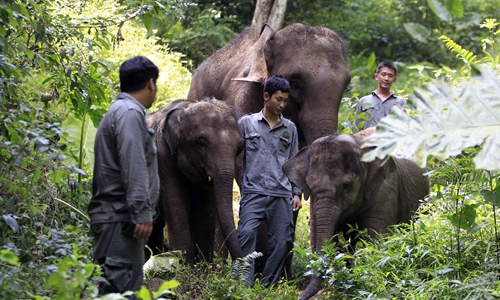 Breeders take wild Asian elephants "Xiaoqiang" (L) , "Ranran" (C) and "Yangniu" (R) to conduct field training in the forest at Asian Elephant Breeding and Rescue Centre in Xishuangbanna Dai Autonomous Prefecture, southwest China's Yunnan Province, June 5, 2017. (Xinhua/Jing Huihui)