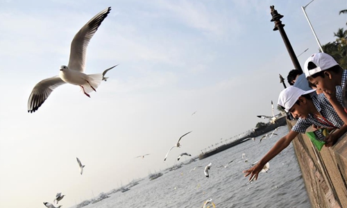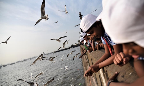 School children feed seagulls in Mumbai, India, Dec.4, 2019. (Photo by Fariha Farooqui/Xinhua)