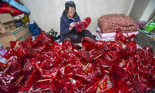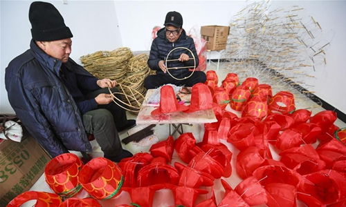 A villager makes lanterns at Jianguzhuang Village of Houyi Township in Yongqing County, north China's Hebei Province, on Dec. 8, 2019. As the Chinese New Year is drawing near, villagers of Houyi Township, renowned for lantern making, are busy making lanterns to supply the markets. (Xinhua/Li Xiaoguo)