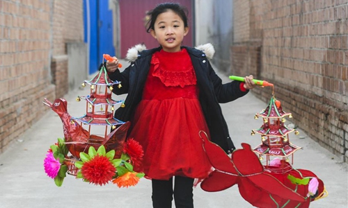 A girl shows lanterns made by her family at Jianguzhuang Village of Houyi Township in Yongqing County, north China's Hebei Province, on Dec. 8, 2019. As the Chinese New Year is drawing near, villagers of Houyi Township, renowned for lantern making, are busy making lanterns to supply the markets. (Xinhua/Li Xiaoguo)
