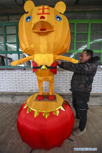 A villager makes a cartoon lantern at Jianguzhuang Village of Houyi Township in Yongqing County, north China's Hebei Province, on Dec. 8, 2019. As the Chinese New Year is drawing near, villagers of Houyi Township, renowned for lantern making, are busy making lanterns to supply the markets. (Xinhua/Li Xiaoguo)
