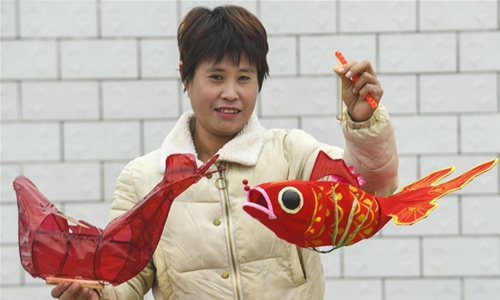 A villager shows lanterns made by her family at Jianguzhuang Village of Houyi Township in Yongqing County, north China's Hebei Province, on Dec. 8, 2019. As the Chinese New Year is drawing near, villagers of Houyi Township, renowned for lantern making, are busy making lanterns to supply the markets. (Xinhua/Li Xiaoguo)