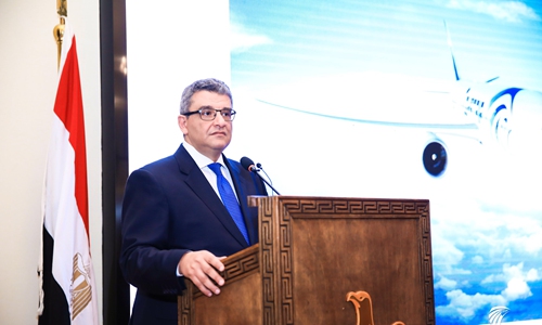 Mohamed Elbadri, ambassador of Egypt to China, delivers a speech at a ceremony in Beijing on Friday celebrating EgyptAir's 16th year of operations in China. Photo: Courtesy of Egypt Embassy in China
