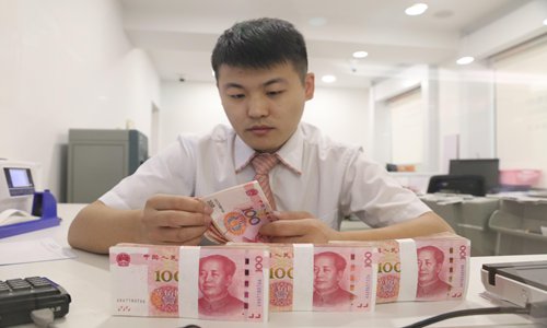 A bank employee is counting the yuan currency in Harbin, Northeast China's Heilongjiang Province in August.Photo: VCG