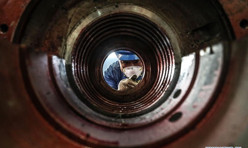 An employee works at Shenyang Blower Works Group Corporation in Shenyang, capital of northeast China's Liaoning Province, Feb. 10, 2020. The large-scale enterprise with thousands of employees resumed its production on Monday. In a circular released over the weekend, the State Council, or China's cabinet, urged efforts to protect workers from getting infected and meanwhile resume production as soon as possible. (Xinhua/Pan Yulong)