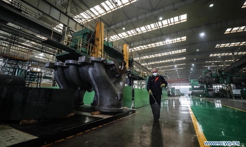 An employee disinfects a plant at Shenyang Blower Works Group Corporation in Shenyang, capital of northeast China's Liaoning Province, Feb. 10, 2020. The large-scale enterprise with thousands of employees resumed its production on Monday. In a circular released over the weekend, the State Council, or China's cabinet, urged efforts to protect workers from getting infected and meanwhile resume production as soon as possible. (Xinhua/Pan Yulong)