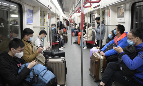 People returning to work after the long Spring Festival holidays take subway from Guangzhou South Railway Station, a railway hub of Guangzhou, South China's Guangdong Province, to downtown of the city on Saturday. Photo:cnsphoto