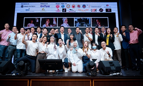 Malaysian music producer Ong Peng Chu (8th L, 2nd row), singers of the song "You are not alone" and guests pose for photos in Kuala Lumpur, Malaysia, Feb. 13, 2020. (Xinhua/Zhu Wei)