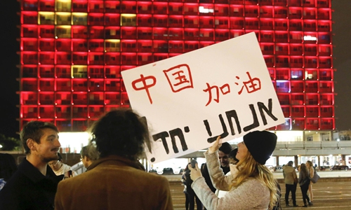 A woman holds a placard to support China in front of the Tel Aviv Municipality Hall lit up with the colors of China's national flag in solidarity with China's fight against novel coronavirus epidemic in Tel Aviv, Israel, Feb. 11, 2020.(Photo by Gil Cohen Magen/Xinhua)