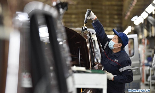 A worker operates at the factory of Chang'an Automobile in Dingzhou, north China's Hebei Province, Feb. 16, 2020. Companies in Dingzhou resumed production with epidemic prevention measures during the outbreak of the novel coronavirus. (Xinhua/Zhu Xudong)
