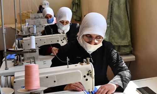 Syrian tailors make face masks at a vocational institute in Damascus, capital of Syria, on April 26, 2020. (Photo by Ammar Safarjalani/Xinhua)