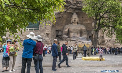 Tourists visit the Yungang Grottoes in Datong, north China's Shanxi Province, May 19, 2018. China Tourism Day falls on Saturday, when many scenic areas give discount on tickets to attract visitors. (Xinhua/Zhang Wei)