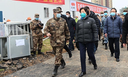 Chinese Vice Premier Sun Chunlan, who leads a central government group to guide the epidemic control work in Hubei Province, inspects Huoshenshan Hospital in Wuhan, central China's Hubei Province, Feb. 2, 2020. Entrusted by Xi Jinping, general secretary of the Communist Party of China (CPC) Central Committee, Sun Chunlan inspected Huoshenshan (Fire God Mountain) Hospital, a newly-delivered hospital to combat coronavirus in Wuhan. (Xinhua/Chen Yehua)