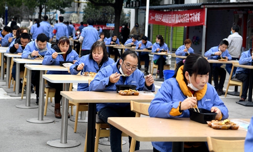 Employees have dinner one person per table on Wednesday at the Midea refrigerator company in Hefei, capital of East China's Anhui Province. The move is aimed to prevent COVID-19 infection as more than 95 percent of the company's employees have come back to work. Photo: cnsphoto