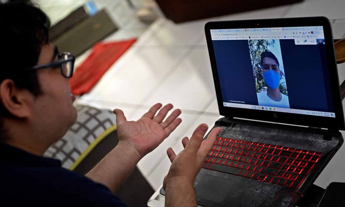 University professor Kevin Salazar communicates online with his student Erick Palacios, who as to climb up a hill to reach internet signal to attend virtual university classes, in Huizucar, El Salvador, on August 18. Photo: VCG