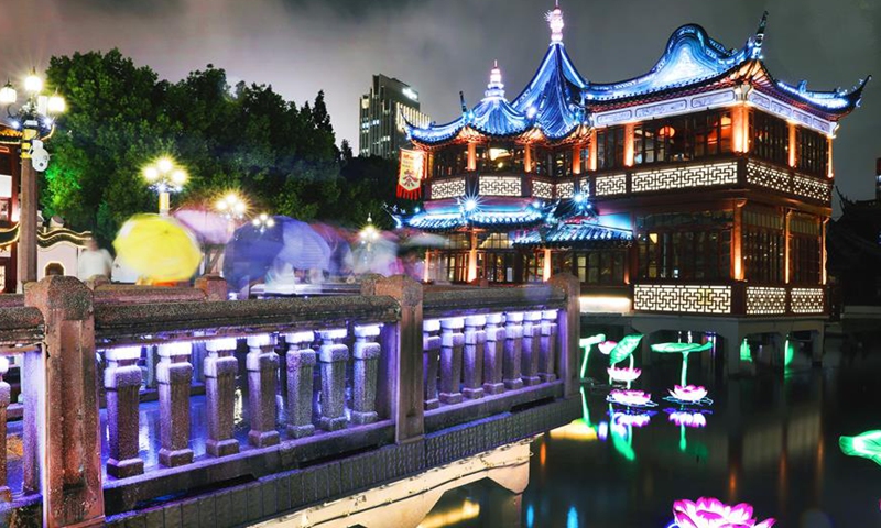 People visit Yuyuan Garden at night in rain in east China's Shanghai, Aug. 28, 2020.Photo:Xinhua