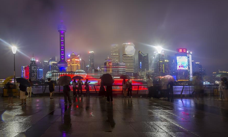 People admire the night view of the Bund in rain in east China's Shanghai, Aug. 28, 2020.Photo:Xinhua