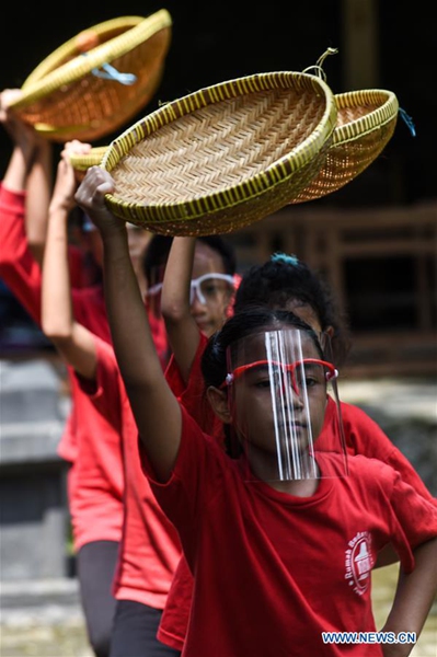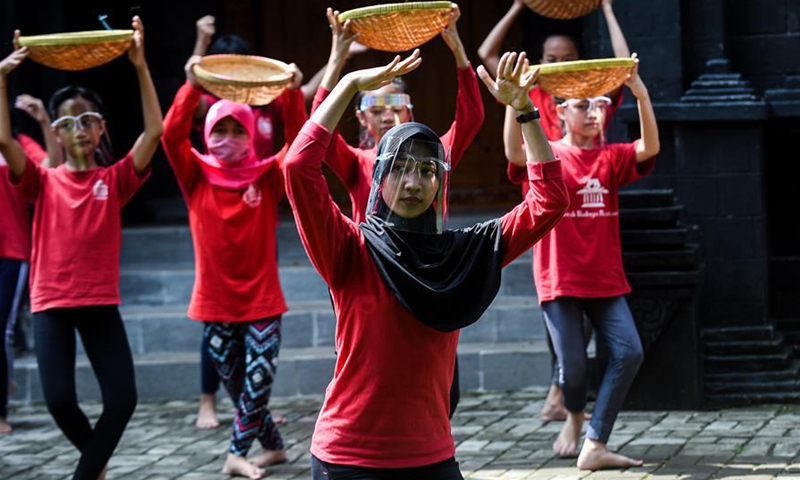 An instructor wearing face shield guides children practice Indonesian traditional dance by following health protocol at Rumah Budaya Nusantara (RBN) Puspo Budoyo in Ciputat district, South Tangerang, Indonesia, Oct. 25, 2020. (Xinhua/Agung Kuncahya B.)