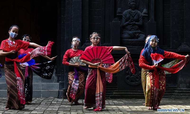 Children practice Indonesian traditional dance by following health protocol at Rumah Budaya Nusantara (RBN) Puspo Budoyo in Ciputat district, South Tangerang, Indonesia, Oct. 25, 2020. (Xinhua/Agung Kuncahya B.)