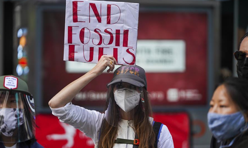 A woman takes part in a climate change protest in Times Square in New York, the United States, on September 20. Photo: Xinhua