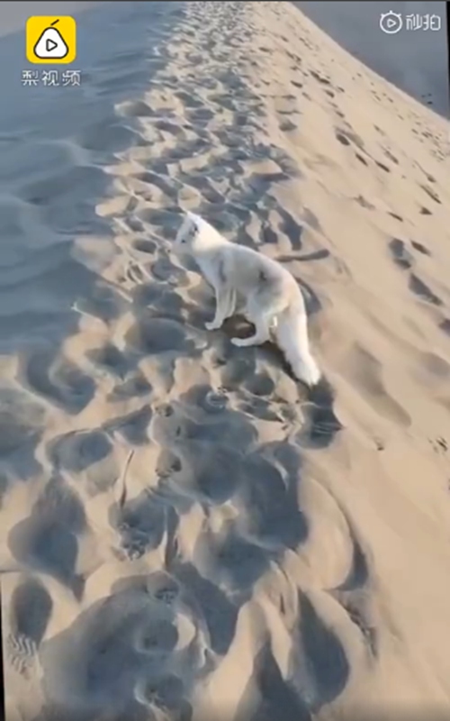 A snowy-white fox has been spotted at Crescent Lake in Northwest China's Gansu Province. The young fox was not aggressive nor afraid of human contact, and even ate the food given to it by tourists, media reported Wednesday. Screenshot of Pear Video on Sina Weibo.