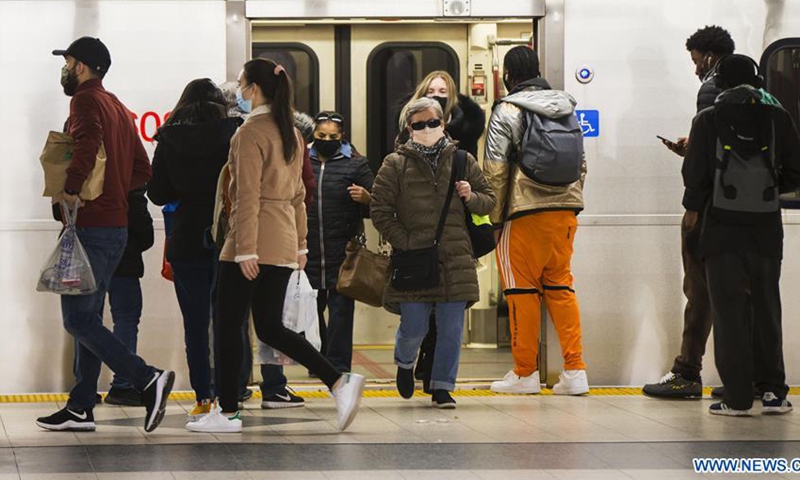 Passengers wearing face masks get on and off a train at a subway station in Toronto, Canada, on November 3. Photo: Xinhua