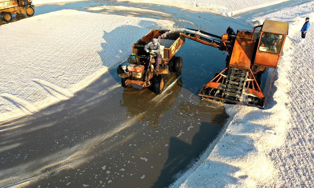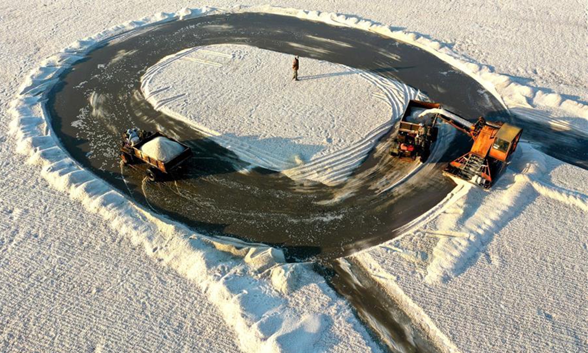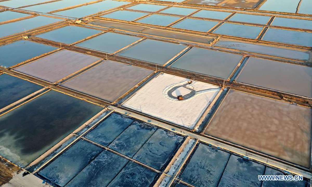 Aerial photo taken on Nov. 4, 2020 shows workers collecting salt in a salt pond at Dongfeng salt field in Qingdao, east China's Shandong Province. Dongfeng salt field has entered the harvest season recently. (Photo by Liang Xiaopeng/Xinhua)