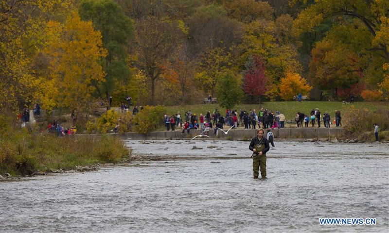 A man fishes salmons during their migration to the spawning grounds in Humber River in Toronto, Ontario, Canada, Oct. 18, 2020. (Photo by Zou Zheng/Xinhua)