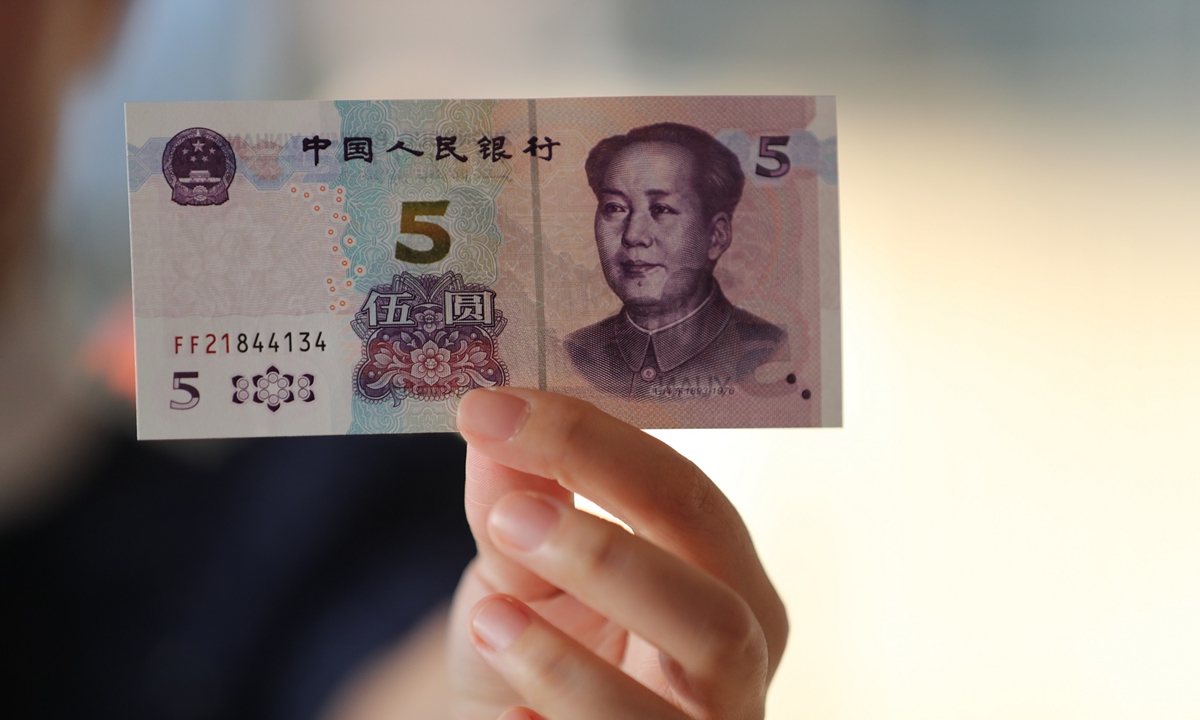A bank employee holds a new banknote worth 5 yuan (0.76 cents) on Thursday. China's central bank issued a 2020 edition of the banknote as part of the fifth series of the yuan currency on Thursday. The new banknote has enhanced anti-counterfeiting features and better printing quality. Photo: cnsphoto