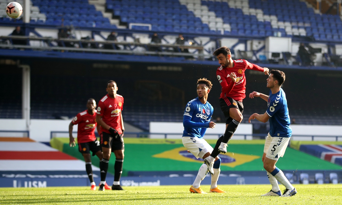 Manchester United's Bruno Fernandes (second from right) scores his side's opening goal against Everton on Saturday in Liverpool, England. Photo: VCG