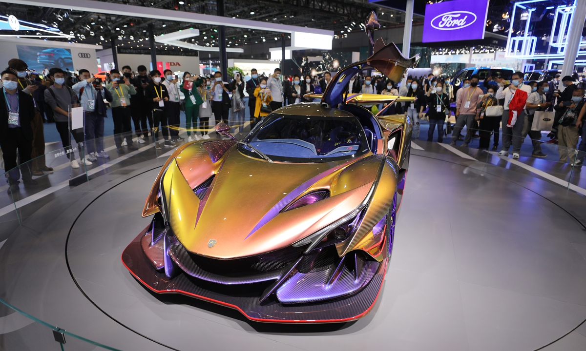 Visitors view an Apollo IE all-carbon fiber sports car. Photo: Yang Hui/GT