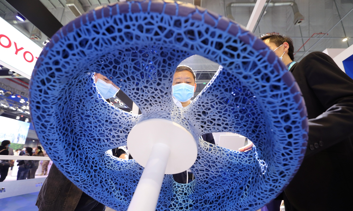 Visitors check the Michelin Vision concept tires at the ongoing third China International Import Expo in Shanghai. Photo: Yang Hui/GT