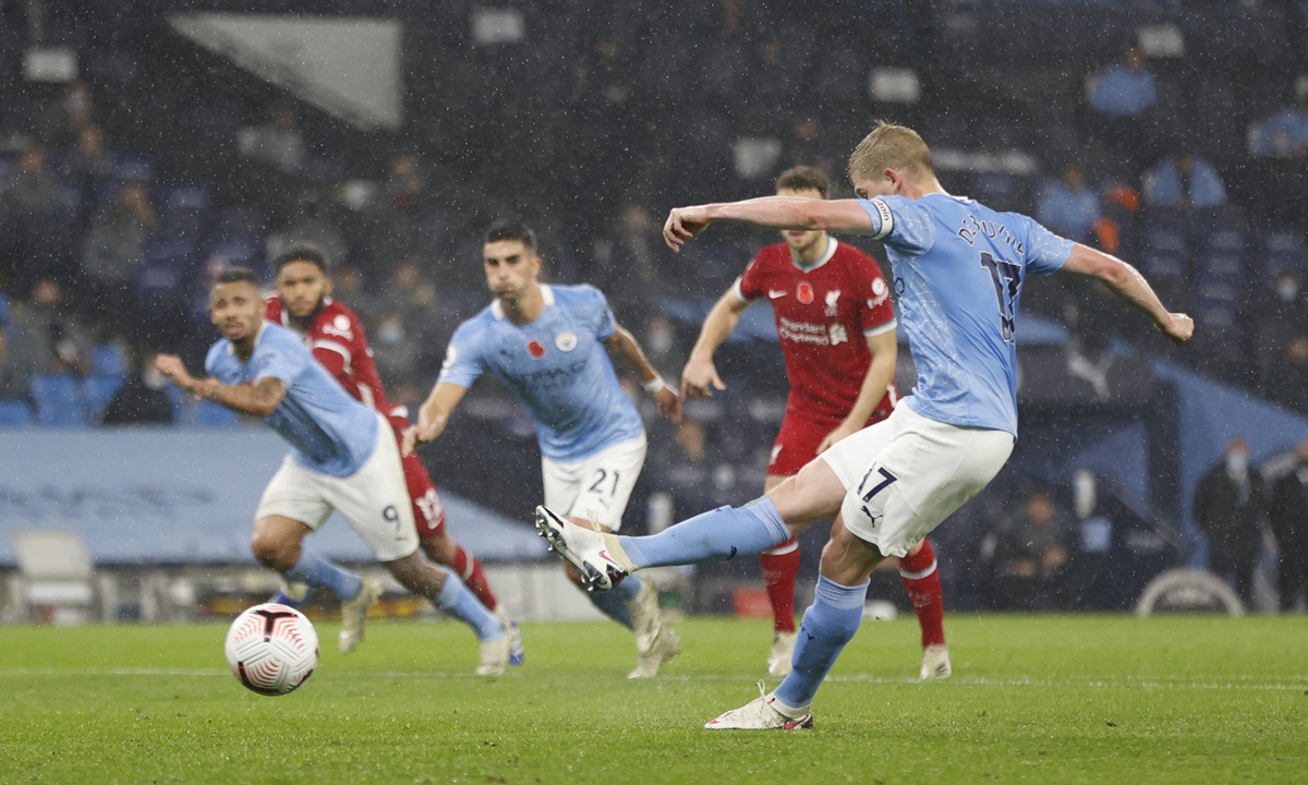 Kevin de Bruyne of Manchester City misses a penalty during the match against Liverpool at Etihad Stadium on Sunday in Manchester, England. Photo: VCG
