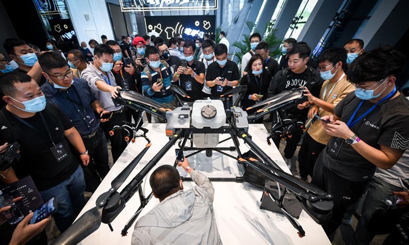 Visitors look at DJI's new crop protection drone T30 after a product launch ceremony in Shenzhen, south China's Guangdong Province, Nov. 9, 2020. Chinese drone maker DJI has launched two new crop protection drones, T30 and T10, here on Sunday. (Xinhua/Mao Siqian)