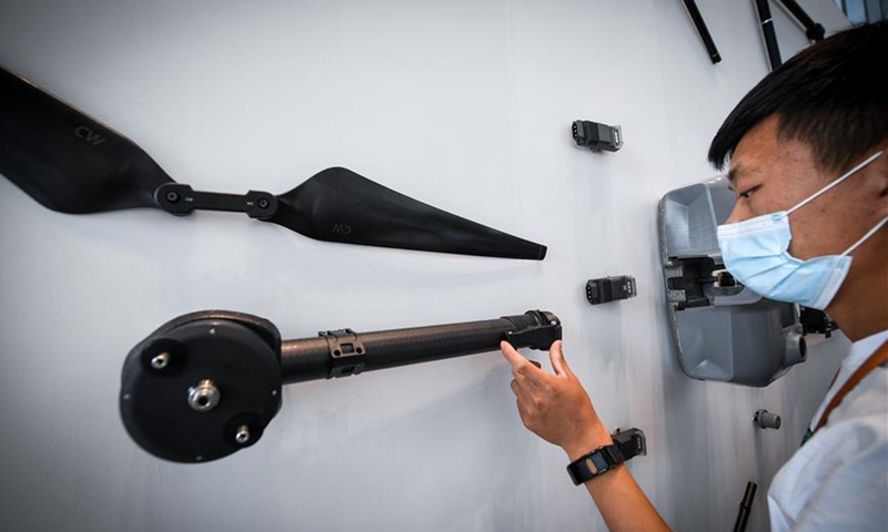 A visitor examines a component of DJI's new crop protection drone T30 after a product launch ceremony in Shenzhen, south China's Guangdong Province, Nov. 9, 2020. Chinese drone maker DJI has launched two new crop protection drones, T30 and T10, here on Sunday. (Xinhua/Mao Siqian)