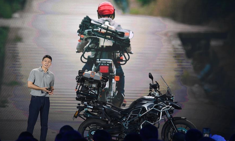 DJI agriculture sales director Chen Tao unveils the company's new crop protection drone T10 at a product launch ceremony in Shenzhen, south China's Guangdong Province, Nov. 9, 2020. Chinese drone maker DJI has launched two new crop protection drones, T30 and T10, here on Sunday. (Xinhua/Mao Siqian)