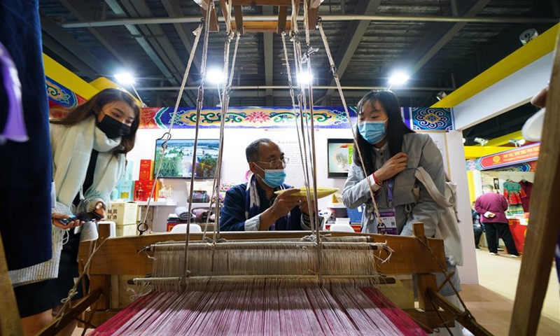 Gao Qinghai (C), an inheritor of intangible cultural heritage, introduces the skills of homespun cloth making from Weixian County, Hebei Province, during the third China International Import Expo (CIIE) in Shanghai, east China, Nov. 8, 2020. The exhibitions of China's intangible cultural heritage at the third CIIE has shown the charm of Chinese culture to exhibitors from all over the world. While promoting economic and trade cooperation, cultural exchanges have also been strengthened here. (Xinhua/Wang Jianhua)