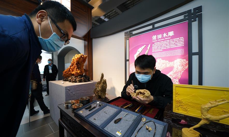 Lin Jianjun (R), an inheritor of intangible cultural heritage, displays the carving skills of Putian Wooden Statue during the third China International Import Expo (CIIE) in Shanghai, east China, Nov. 8, 2020. The exhibitions of China's intangible cultural heritage at the third CIIE has shown the charm of Chinese culture to exhibitors from all over the world. While promoting economic and trade cooperation, cultural exchanges have also been strengthened here. (Xinhua/Wang Jianhua)
