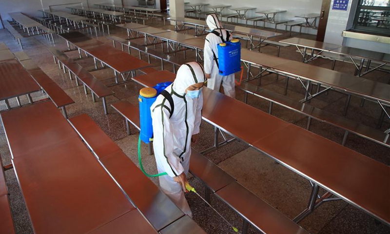 Staff members conduct disinfection at the dining hall of a primary school in Yuqing, southwest China's Guizhou Province, Aug. 27, 2020. Photo:Xinhua