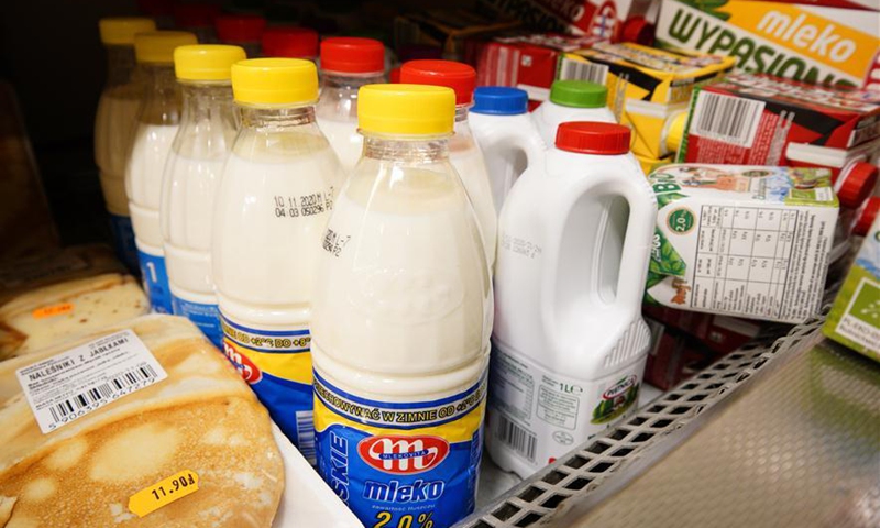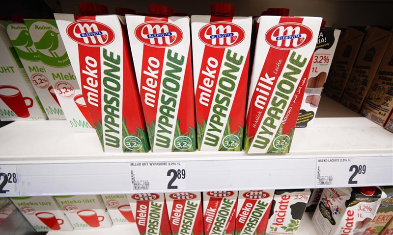 Mlekovita branded milk is seen on shelves at a supermarket in Warsaw, Poland, Nov. 5, 2020. The European Union (EU) is one of the largest milk suppliers to Chinese market, with Poland accounting for a share of 12.7%, according to Director of Polish Milk Chamber Agnieszka Maliszewska. Statistics from Poland's Ministry of Finance show that, despite the impact of COVID-19, the export of dairy products from Poland to China grew by 70% year on year in the first half of 2020. Recently, batches of Polish dairy products took freight trains to China for the occassion of Single's Day shopping festival in the country. (Photo by Jaap Arriens/Xinhua)